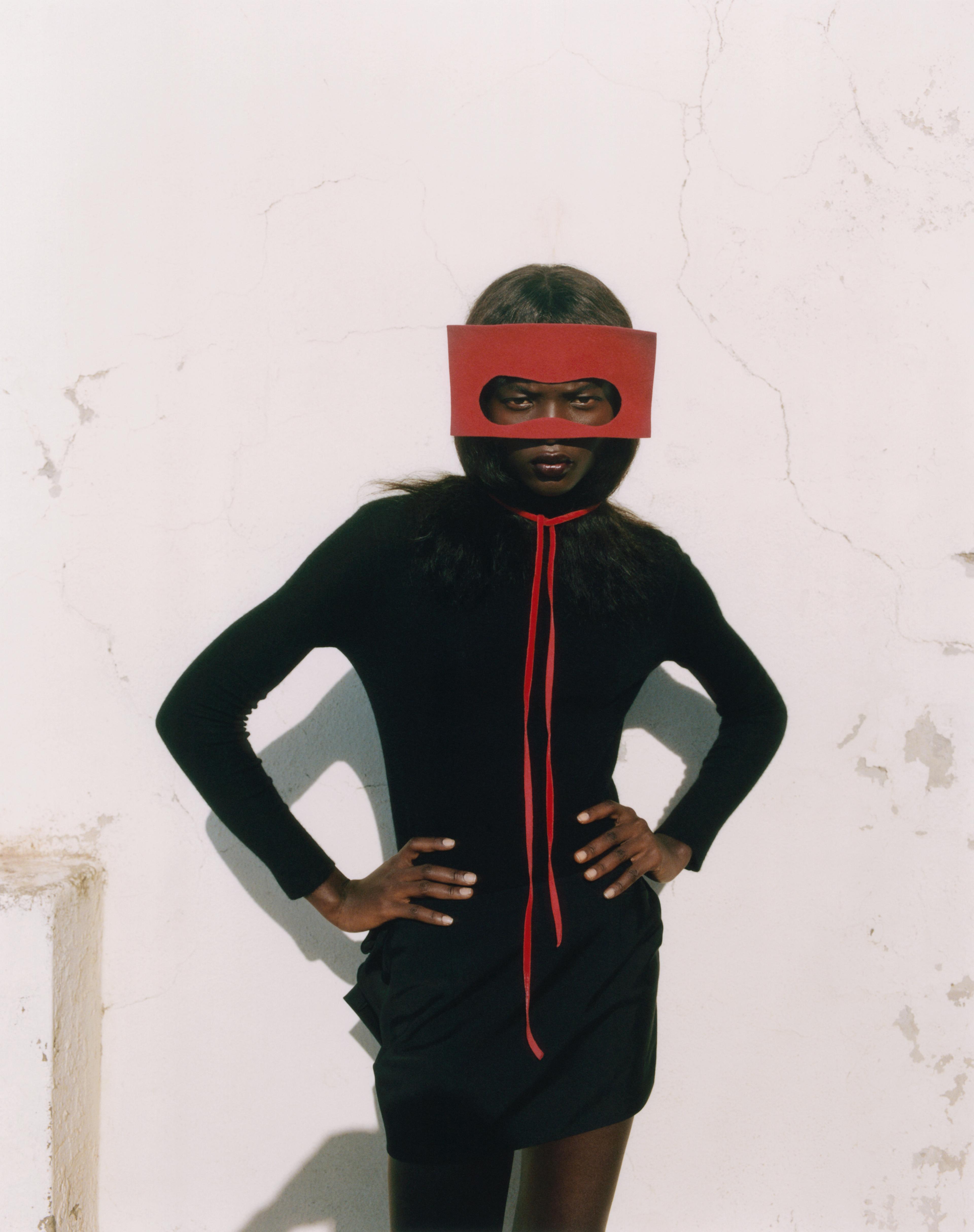 AJUS WEARS BLACK TURTLENECK AND SKIRT BY DIOR. RED TULLE MASK BY MARIA GRAZIA CHIURI FOR DIOR HAUTE COUTURE SS18, DIOR HERITAGE COLLECTION PARIS.