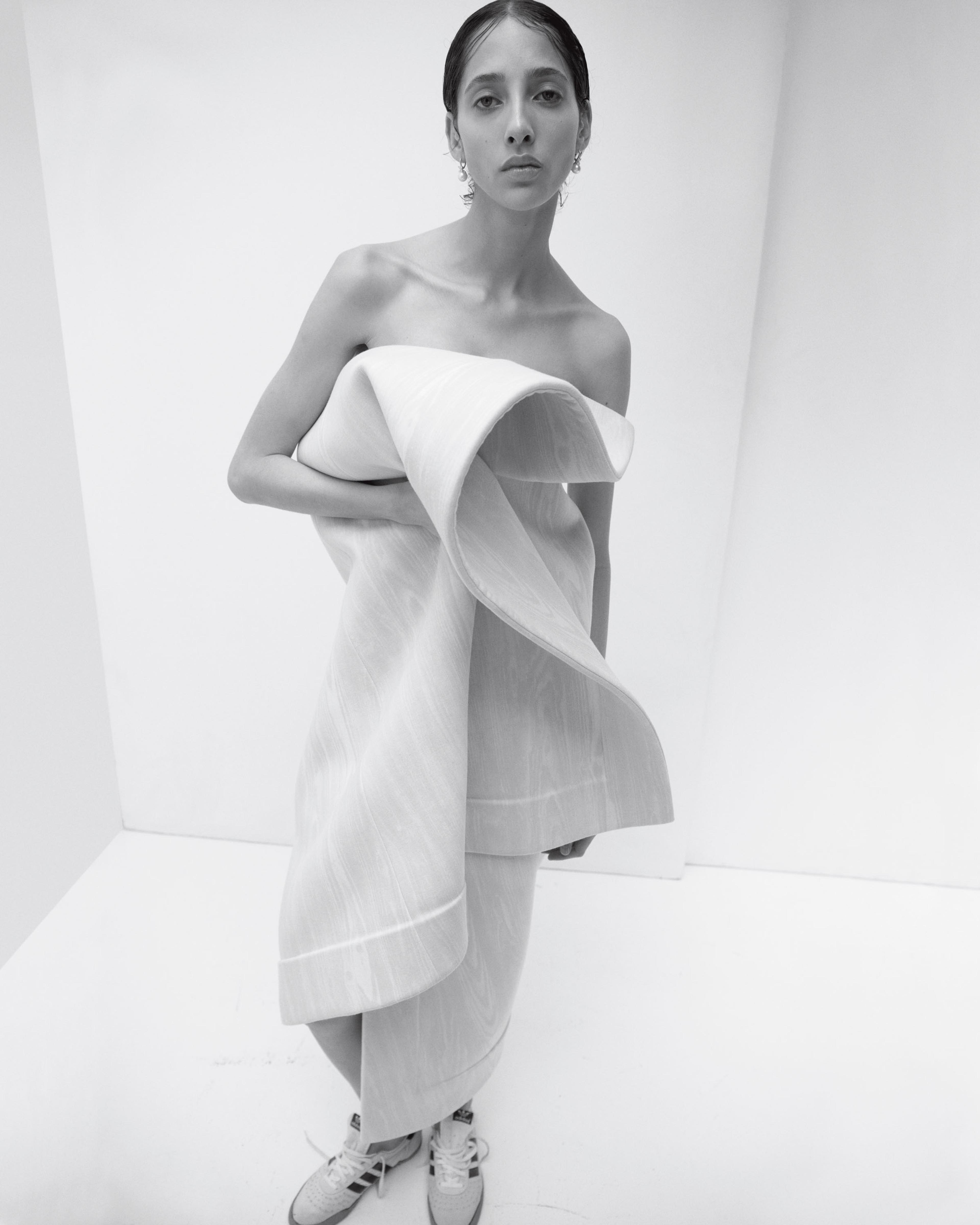 COTTON TOP AND COTTON BOUCLÉ SKIRT BY BOTTEGA VENETA. WHITE TIGHTS STYLIST'S OWN. WHITE LEATHER SHOES BY ISSEY MIYAKE.