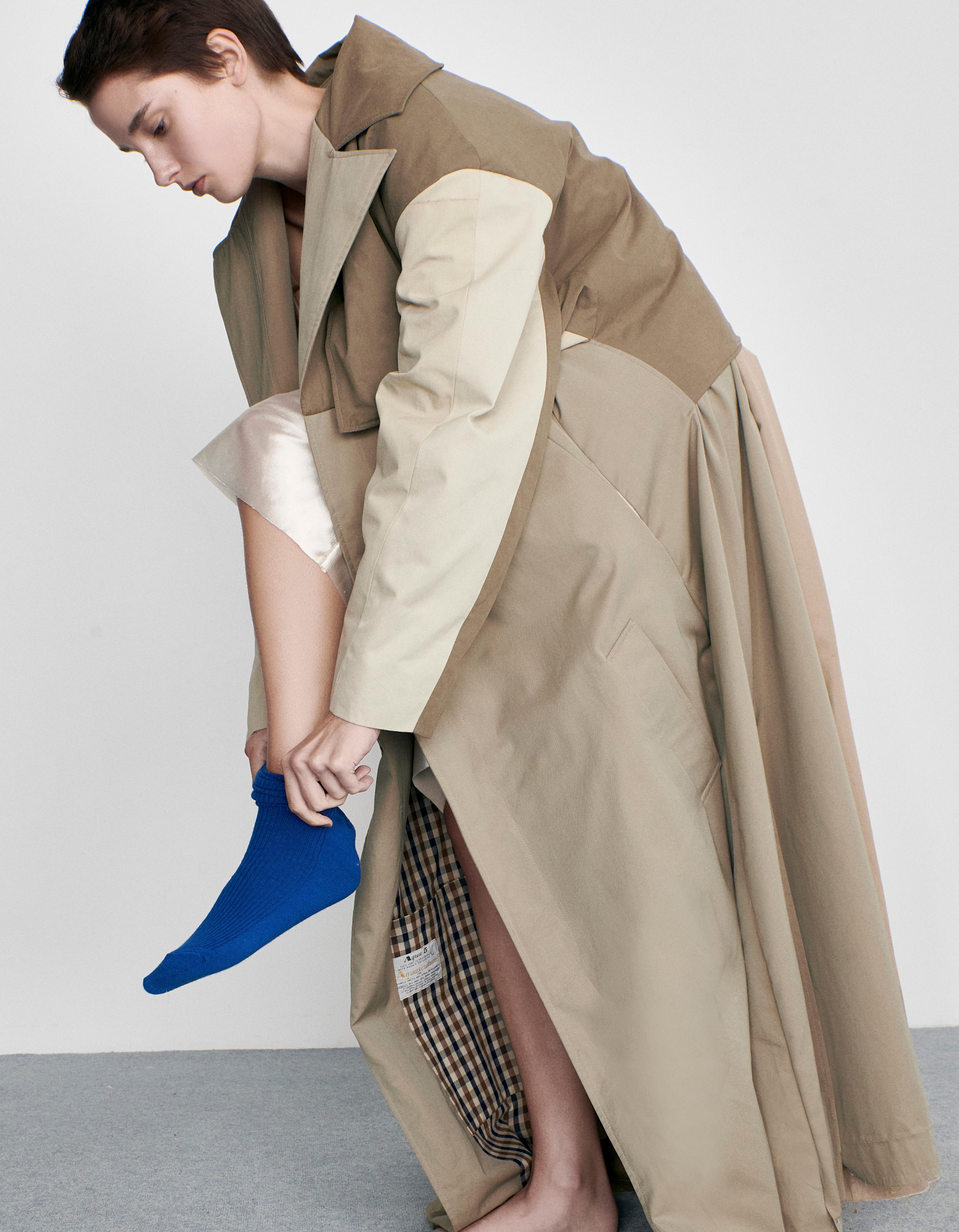 BEIGE UPCYCLED GABARDINE COAT, CREAM DEADSTOCK POLY BLEND SHORTS, BLUE COTTON SOCKS BY LOUTRE.