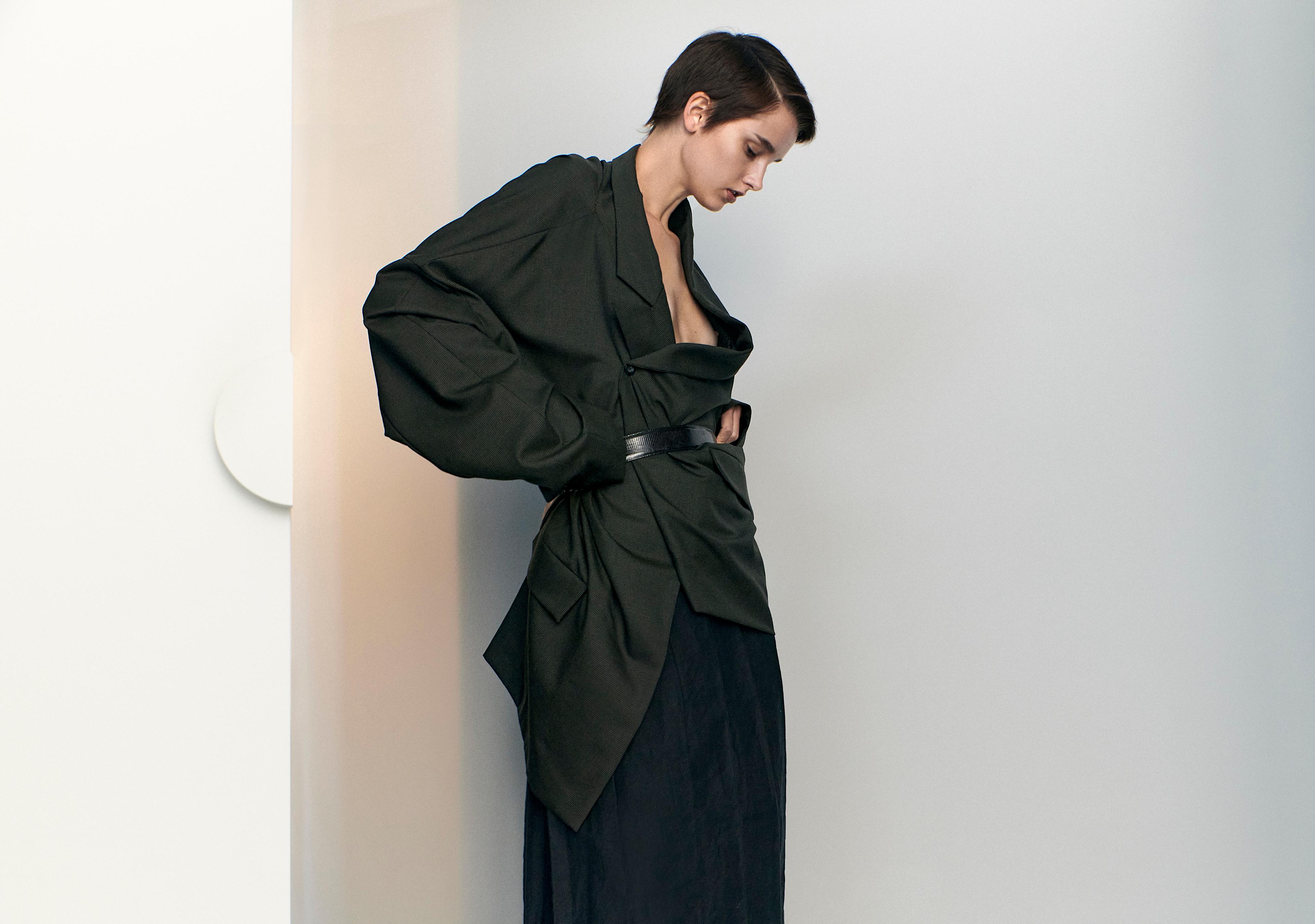 PHOEBE WEARS DARK GREEN WOOL JACKET, BLACK COTTON SKIRT AND LEATHER BELT BY LOUTRE.