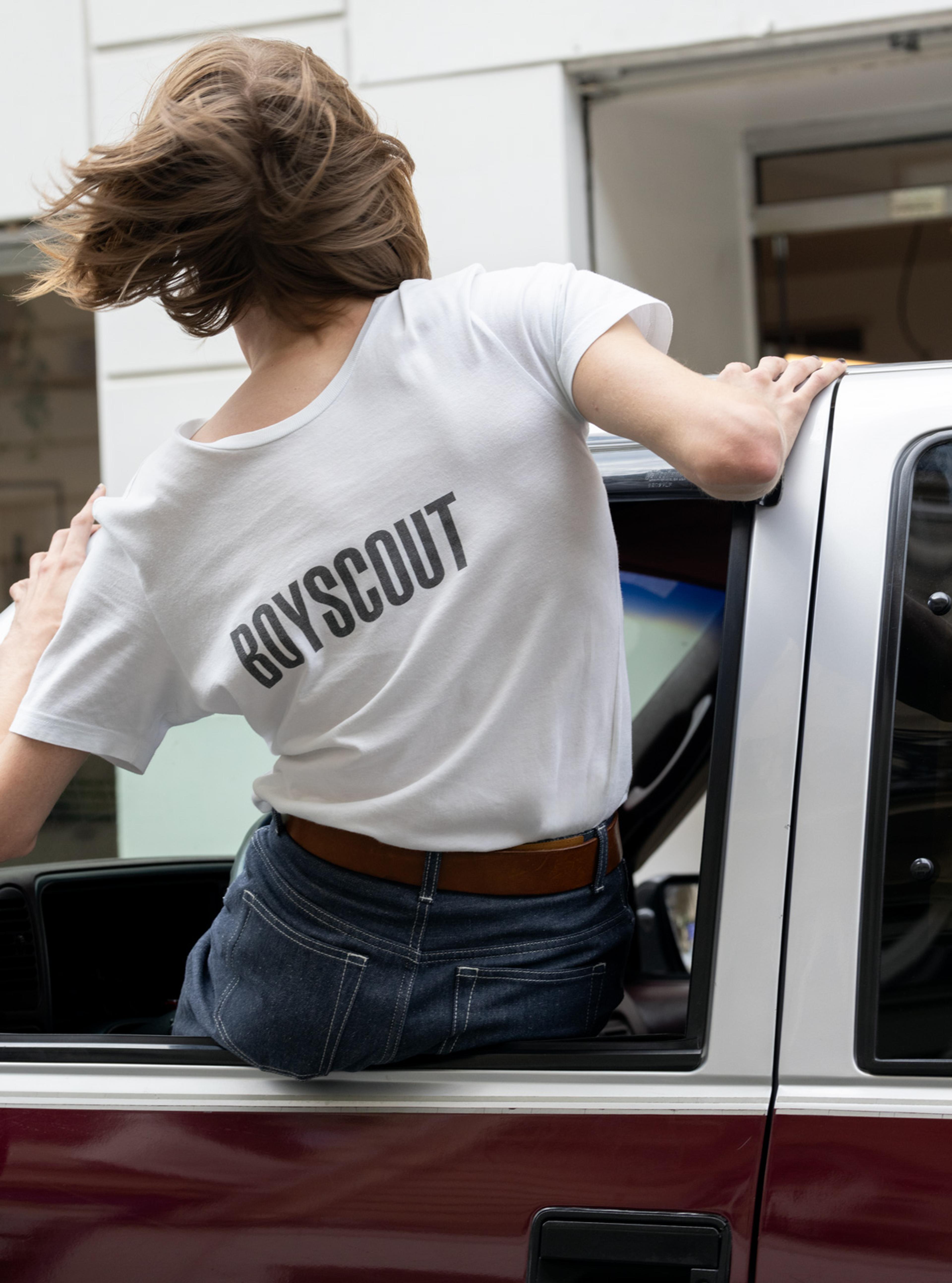KILLIAN WEARS VINTAGE HELMUT LANG COTTON T-SHIRT FROM ENDYMA ARCHIVE. BLUE DENIM JEANS BY LORO PIANA.