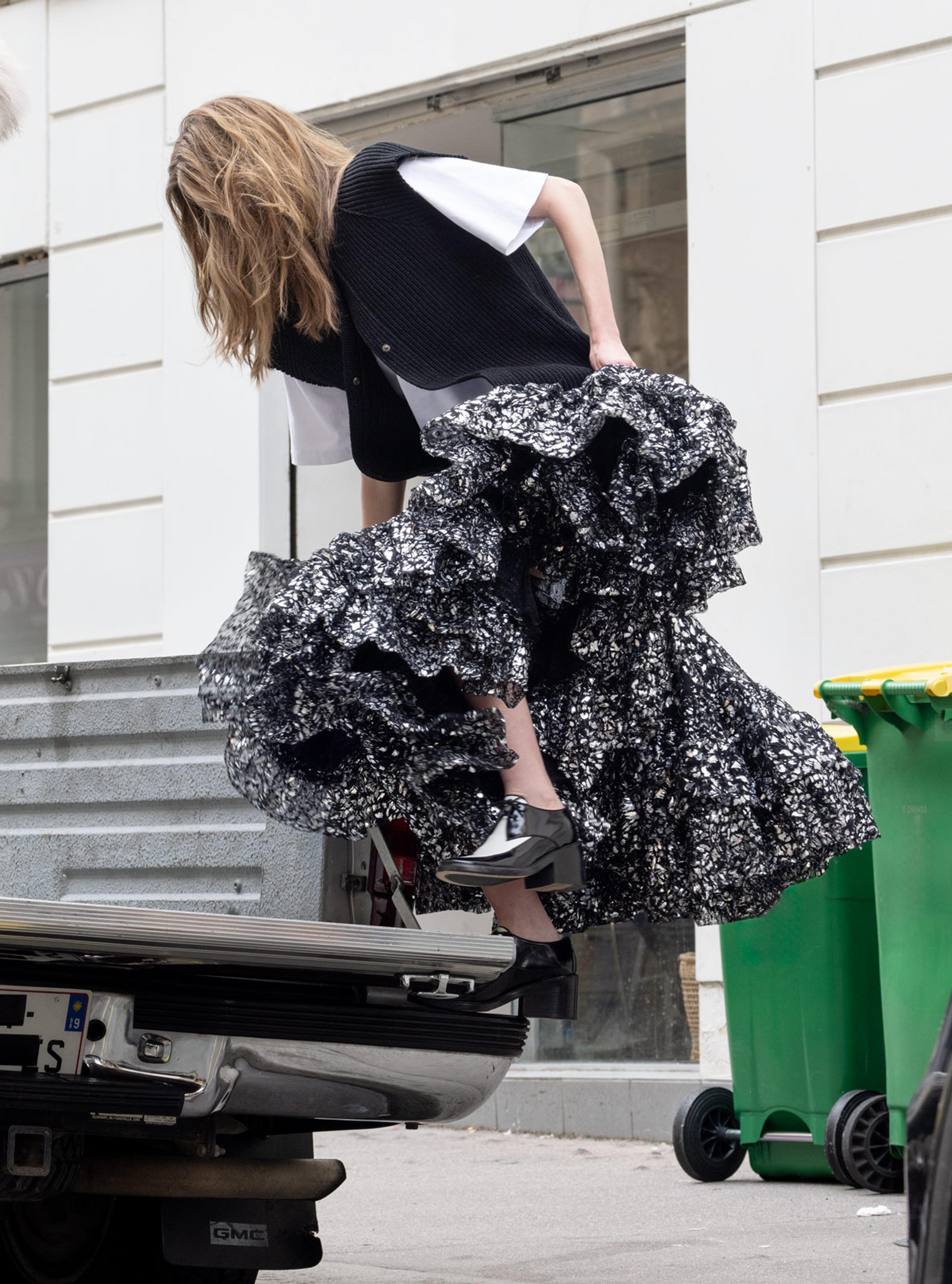 THERESE WEARS WHITE COTTON T-SHIRT, BLACK WOOL SLEEVELESS CARDIGAN, SILK TULLE SKIRT, BLACK LEATHER SHOES BY LOUIS VUITTON.