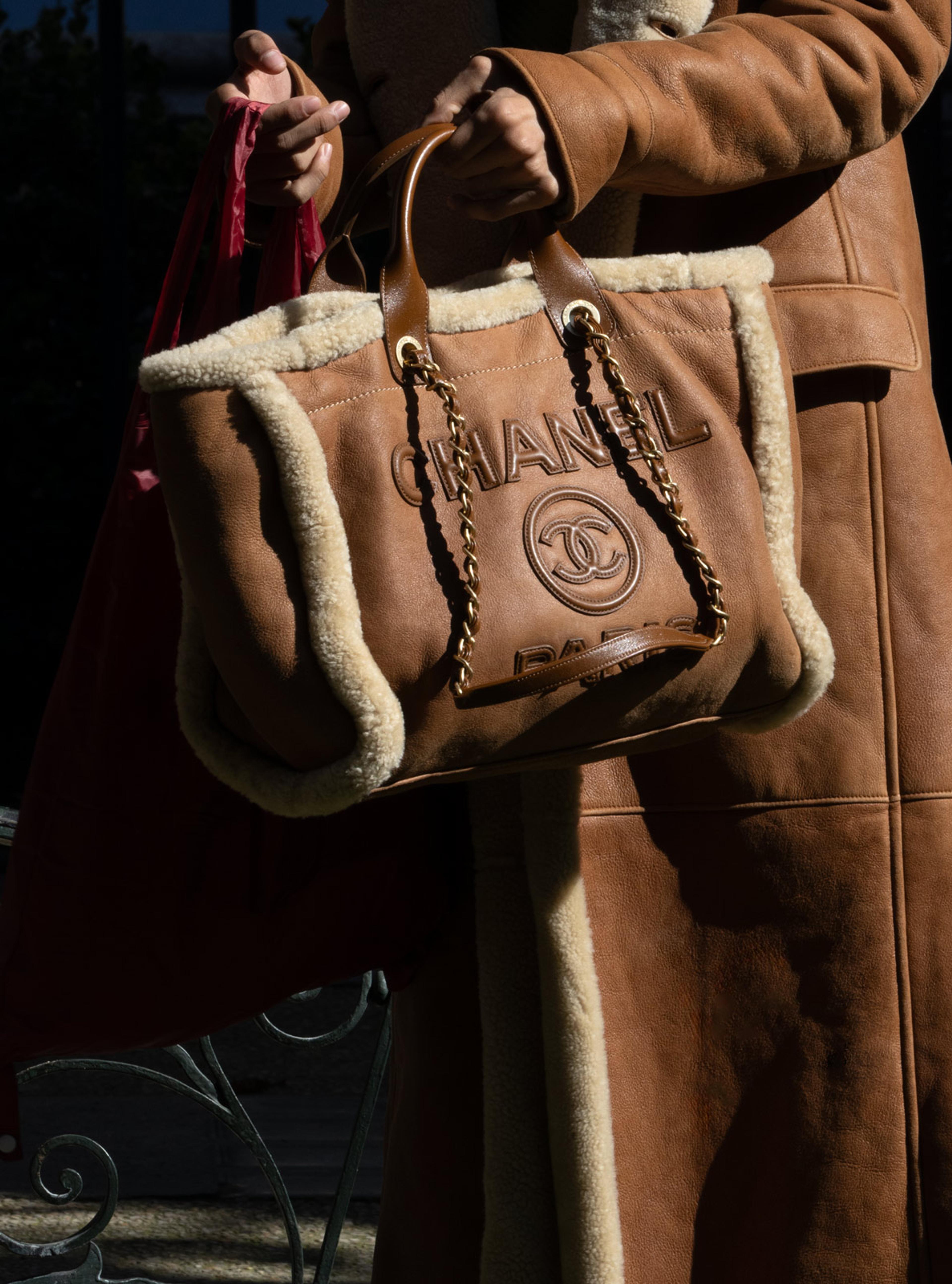 MATHIAS WEARS BROWN SHEARLING COAT AND BAG BY CHANEL.